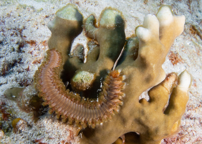 There were many eagle rays, green moray eels, turtles, lot's of juvenile drums, and seahorses. Not many lionfish but did see larger ones on shallower reefs. I got a photo of a brown large eye toadfish. My friend just bought a new camera and he got the photo of what is most likely a pelagic tunicate/pyrosome. I posted on SB’s Name that Critter. I have seen them here before but not with the white dots in them.