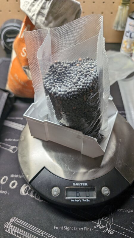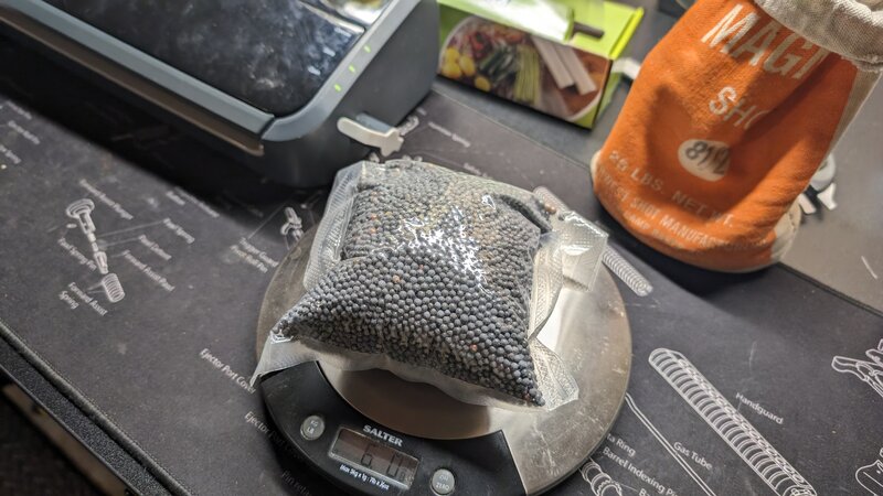 But safety first. Working with lead shot means a lot of lead dust and fine particulates. I turned on a small fan that circulated air out of my workbench area, opened my garage doors for ventilation. Wore a 3m half-face respirator, safety goggles, and disposable gloves. Had wet wipes on the side to wipe down the scale and Foodsaver machine immediately after.