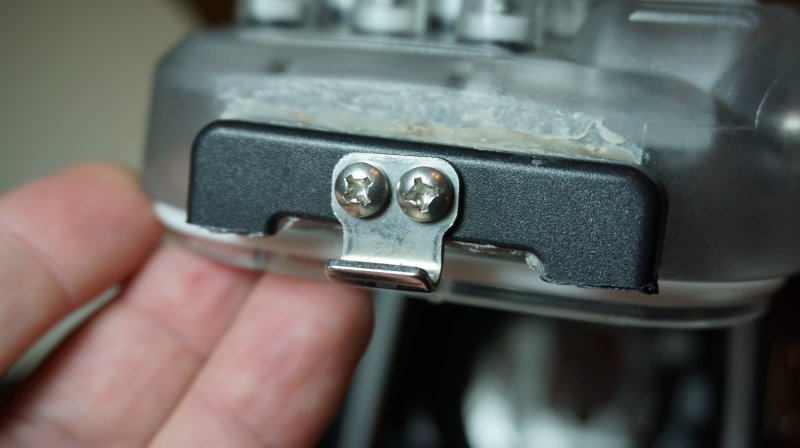 Before i put my expensive camera Into the housing I took it for a dive to 125 feet , and Made sure it was 100% good and not leaking in any way .. I built a tray for the camera and went to the hardware store and got 3 stainless steel bolts and washers to attach the Housing to the tray.. the black strip is a plastic , like Lucite , very tough and very durable ..