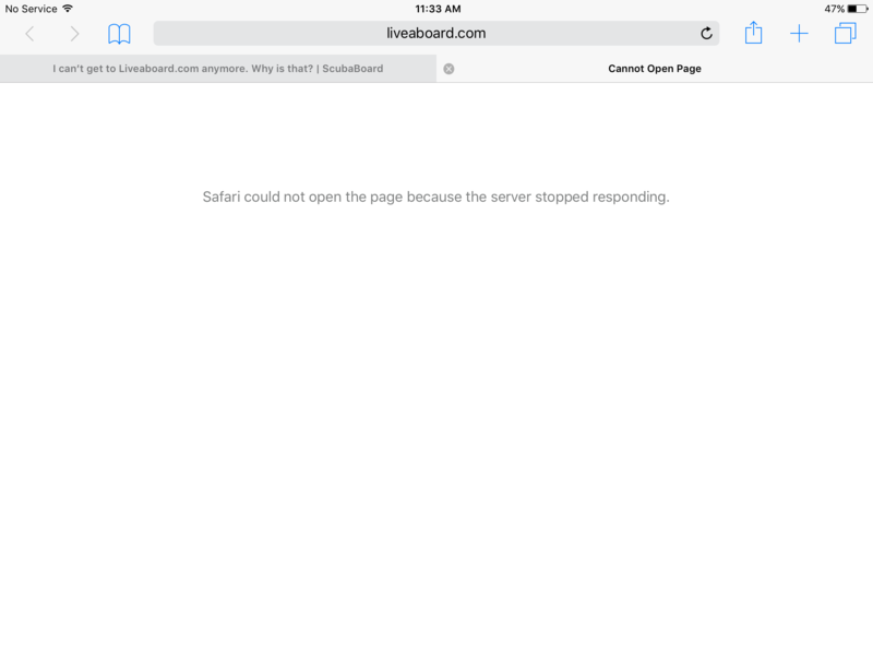 I try to open liveaboard.com from my iPhone or iPad or laptop running Windows 10. All of the devices says no can't do. Even by tapping their ads on this Scubaboard page on the left side of the screen. A new blank page pop up and it says loading and then it says "Safari could not open the page because the server stopped responding" (see the screenshot, below). Why is that? Help!