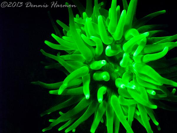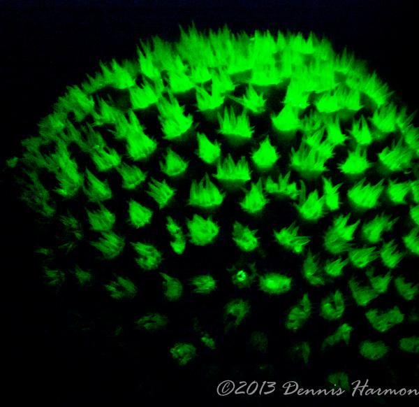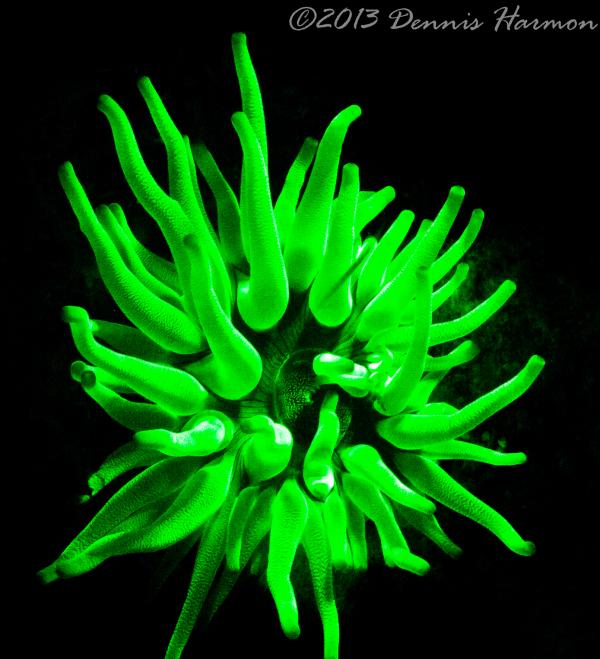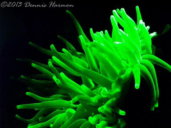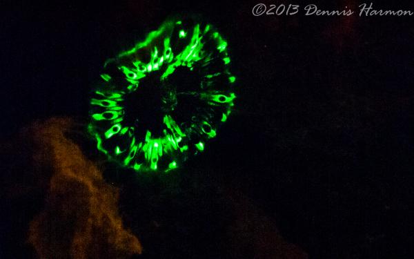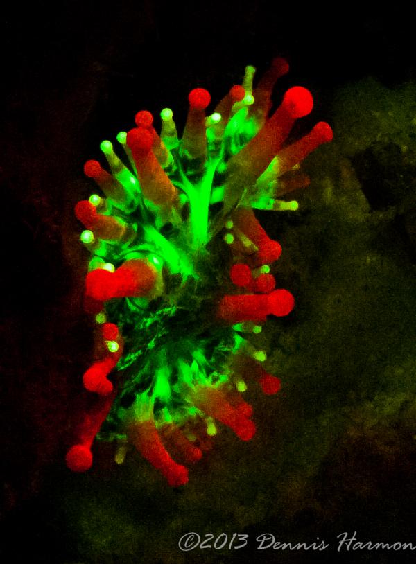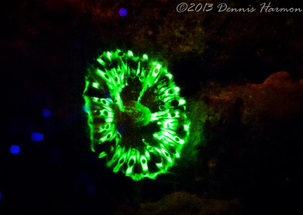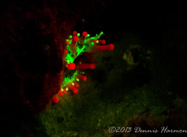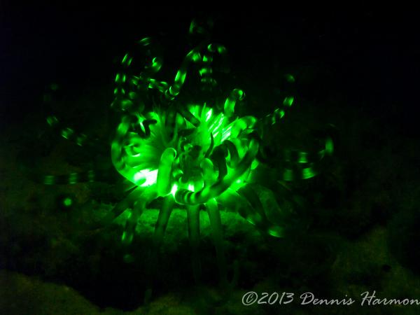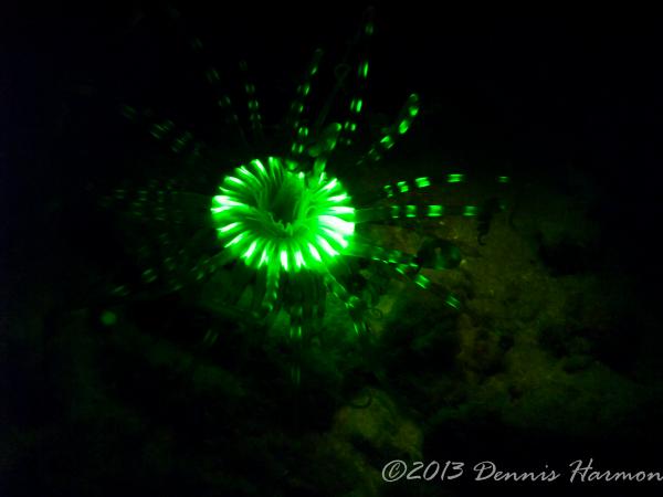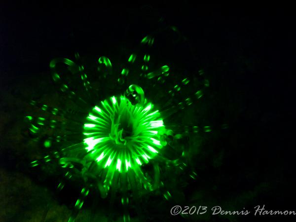 Also please remember there is what I see as a STEEP learning curve to get any pictures. My first big mistake was the wrong lens, Wide angle doom was a poor choice. I was hoping to capture large reef scape WRONG. I should have had a macro lens, the focus is much to short for a dome to capture the Bio-luminescence IMO. Next big mistake is not putting the light near the camera lens, I had Rox and Lynn lighting up the animals thinking I would be free to adjust the camera without the extra task of lighting. Also I am not really happy with my choices of aperture and shutter speed but hey this was the first time I ever tried Floro photography and only did it for 1 dive. All that said even a blind squirrel finds a nut now and then and I cannot wait to try the new ideas I have when I get another chance.
