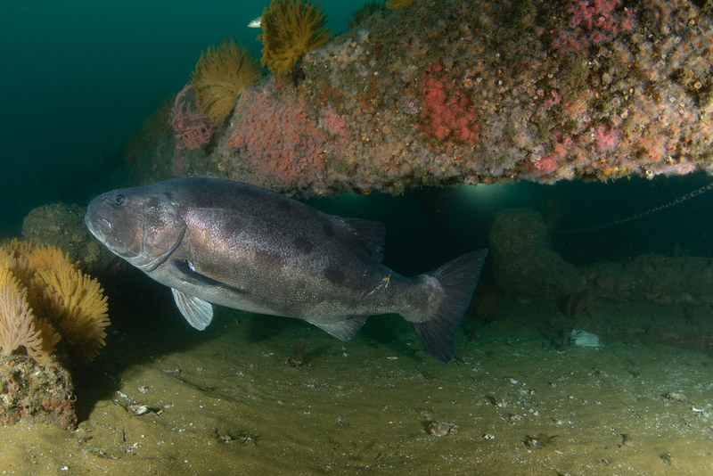 I put everything back together and jumped in to join Merry just as she was nearing the end of her dive. The lone bright spot of the day was that visibility had improved to twelve feet, about twice the visibility we had on our last dive here. Several Giant Sea Bass seemed to recognize us and allowed us to stick our dome ports within inches of them. A few of the large fish would rest under the Rodeo Bar while surge pushed them toward my camera. I had to pull my camera back several times to avoid making contact with the gentle giants. We found the remains of a triggerfish. I tried to offer it to our large friends but they weren't hungry. The smaller fish pecked on it instead.