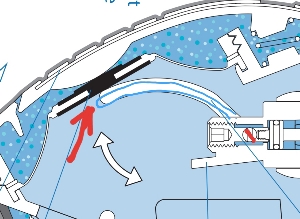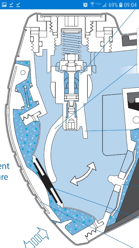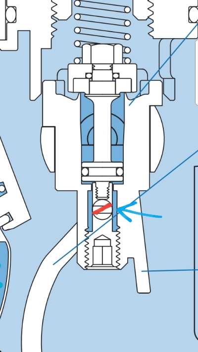 So...you tighten the top hex to try to make the hiss stop. That tries to depress the poppet, but it is very unpredictable. Why? Because with the lever in contact with the diaphragm, as you increase spring pressure, whatever additional seat compression you obtain with the top hex and spring is counterbalanced by the additional force that the poppet is placing on the lever, and the additional stretch that is being applied to the diaphragm. This pushes back, counteracting the additional pressure provided by the top hex. So you tighten the top hex some more...and the diaphragm pushes back...more. Unstable tuning.