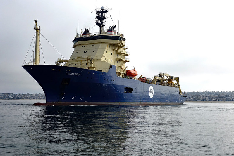 Merry and I planned to dive on the five-mile outfall (Big Pipe) off El Segundo, then make a second dive on Hermosa Reef to visit the Giant Sea Bass. We arrived at the marina to find that someone had absconded with our bird ball. No problem, I thought to myself. We have spares. We stopped at the pumpout station and emptied the head. I forgot the cap on top of the pump. No problem. I'll get it when we come back in. We headed north, passing the cable-laying ship off Hermosa Beach. It is 8/10 of a mile north of Hermosa Artificial Reef, so the GSBs are safe.