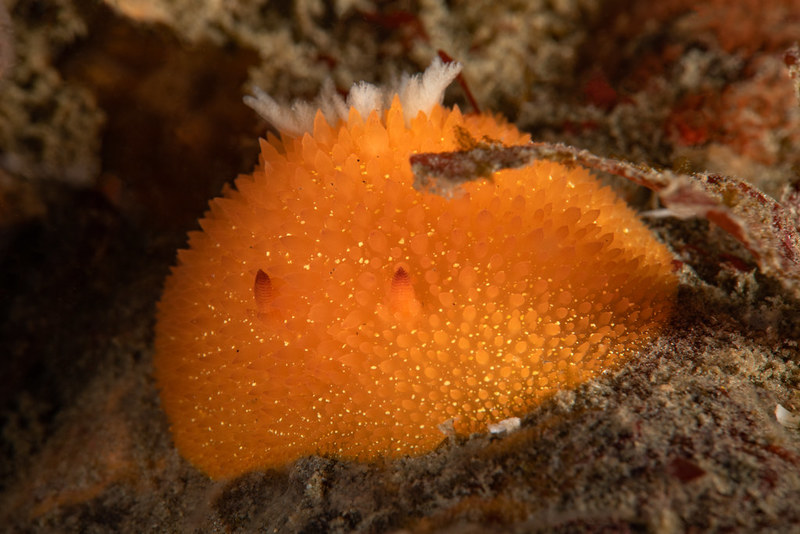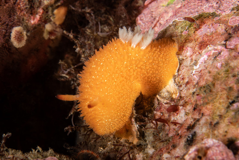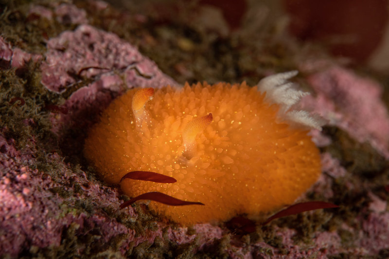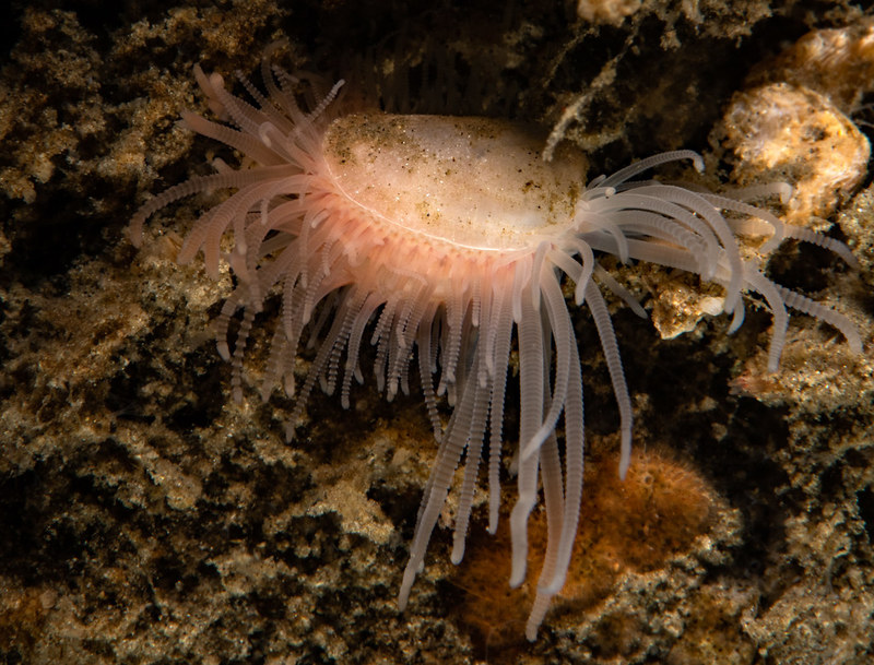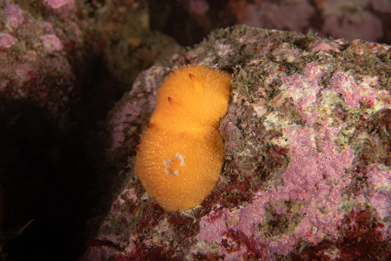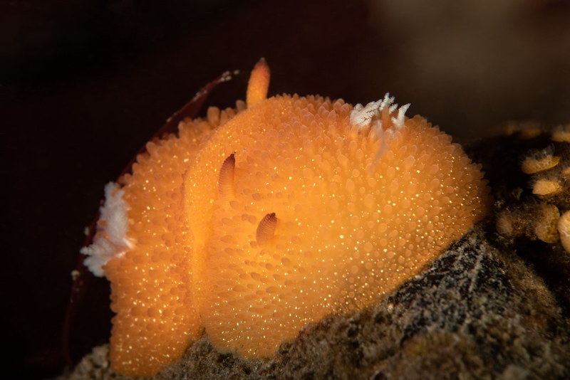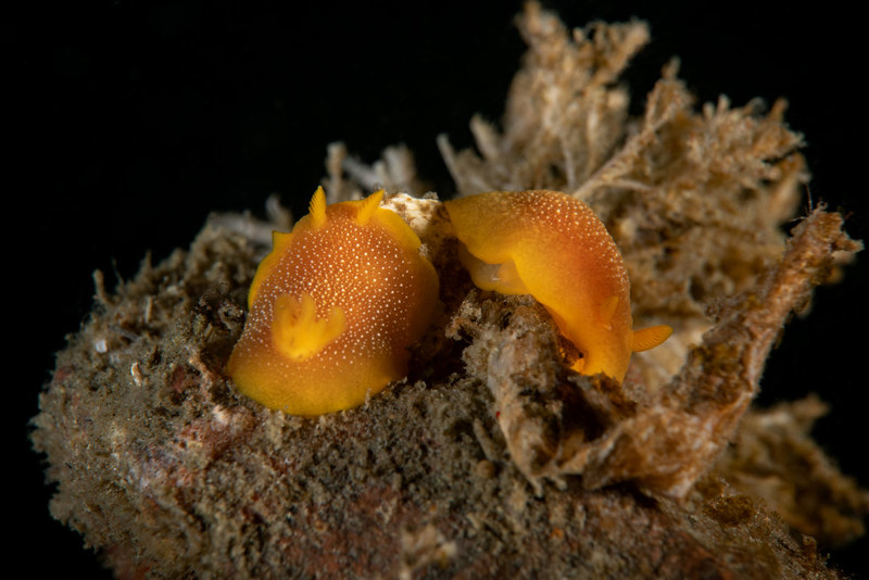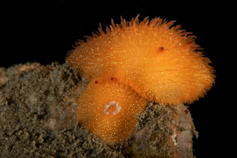 At the Big Pipe, a slight current on the bottom swept sand between our lenses and subjects. No problem. That's what Photoshop is for. The pipe and surrounding rocks were covered with Acanthodoris lutea. These little bunnies were under rocks, on top of rocks, in the sand, and on the concrete pipe. It was difficult to find other subjects with all the orange spots everywhere.
