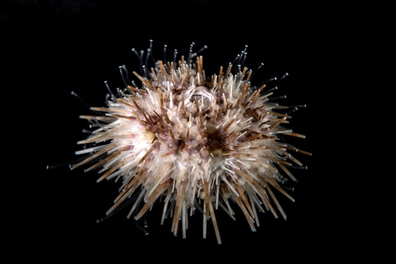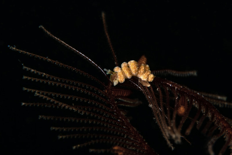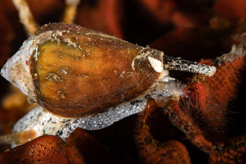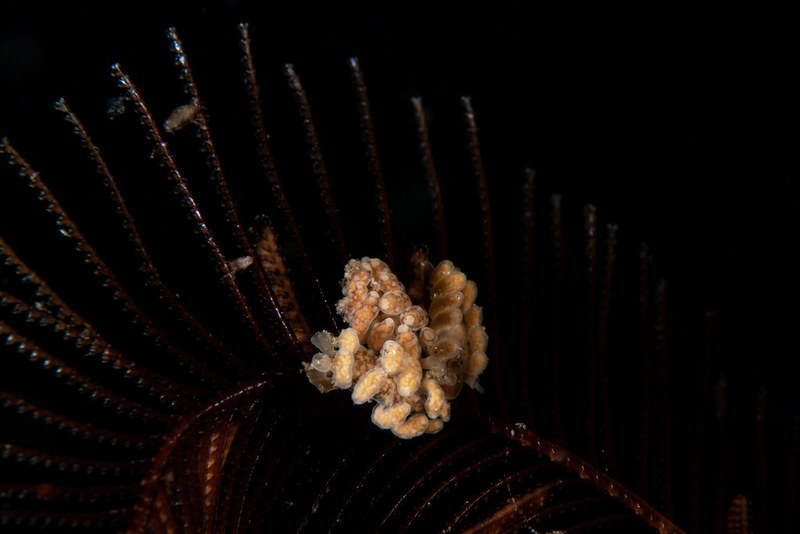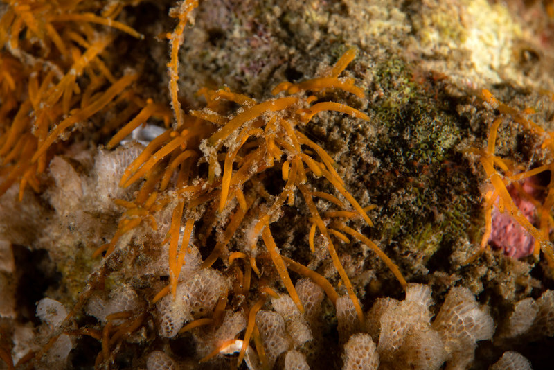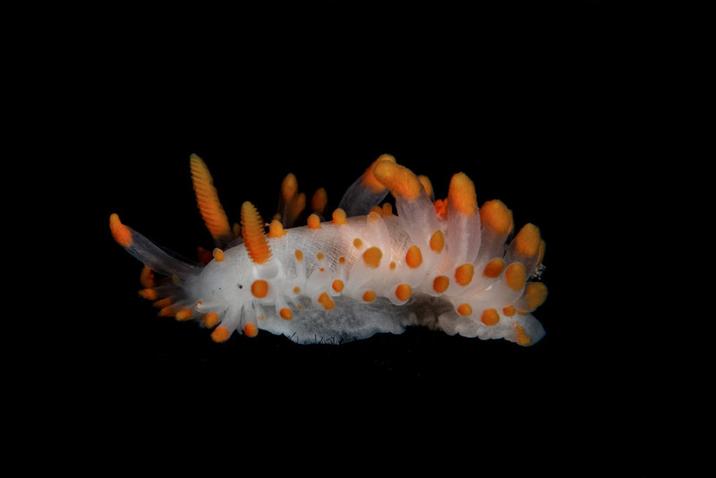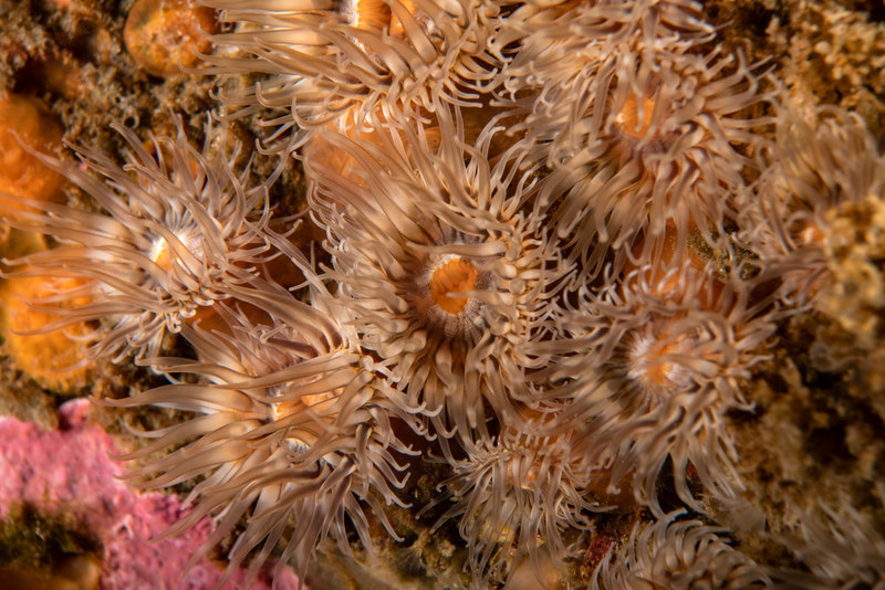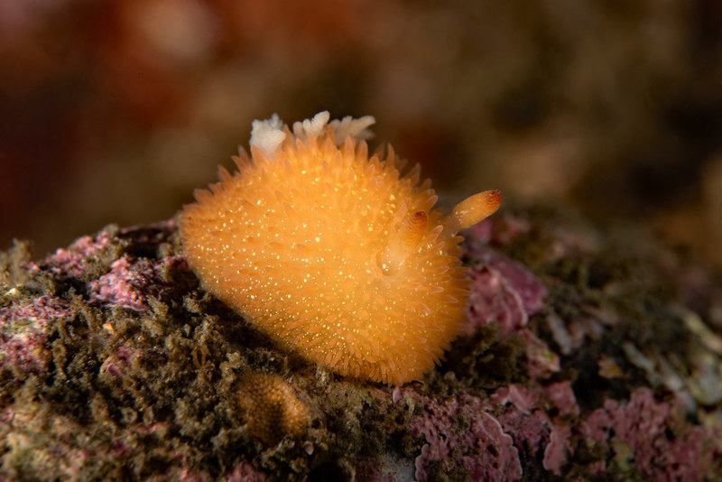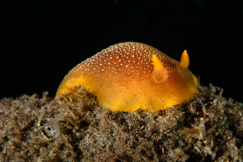 At the Big Pipe, a slight current on the bottom swept sand between our lenses and subjects. No problem. That's what Photoshop is for. The pipe and surrounding rocks were covered with Acanthodoris lutea. These little bunnies were under rocks, on top of rocks, in the sand, and on the concrete pipe. It was difficult to find other subjects with all the orange spots everywhere.