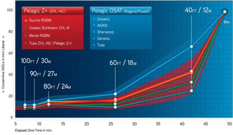 SUUNTO and TUSA are the most liberal implementations of the RGBM algorithm among the major manufacturers. As shown on the chart below.