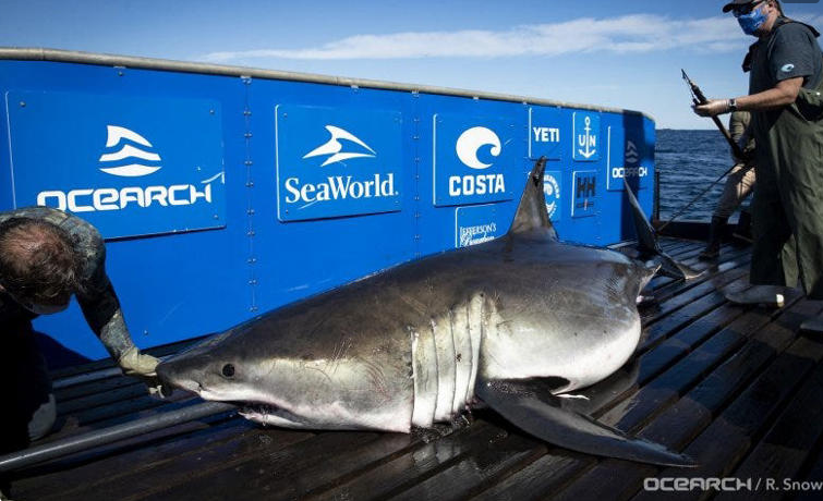 Breton, a male adult white who measures 13 feet 3 inches and weighs 1,437 pounds, is one of dozens of great white sharks tagged and tracked in an open source online database by OCEARCH.