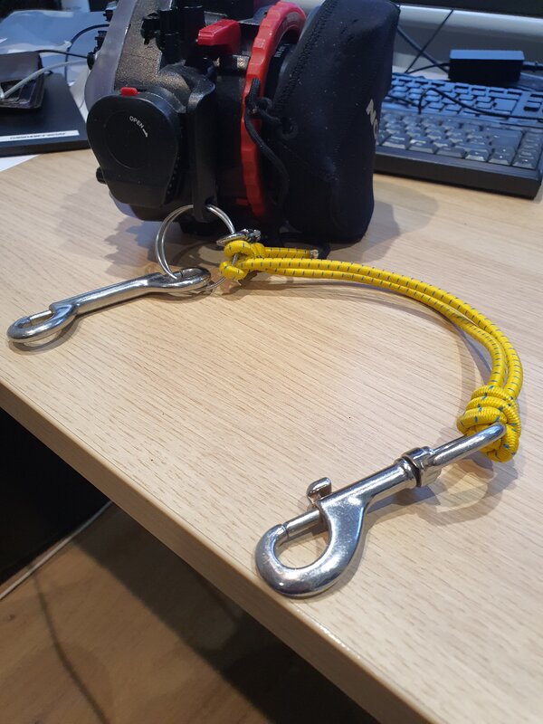 For entry, it depends on situation. If it was calm enough, we'll have the camera handed to us after our entry. However, sometime we giant-stride off the back of a boat in flowing current. So, we hooked the lanyard to D-ring on BCD, unlock the buckle, lift the camera set overhead and big step giant-stride off the boat. Doing this properly the camera won't get any impact at all.