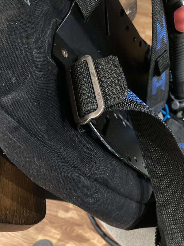 It’s really more that his plate doesn’t have the slots cut in the right position so the webbing lines up with any of the holes.
