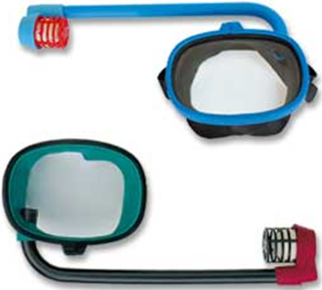 L-shaped breathing tubes, which reduce the amount of residual water retained in the bend at the demand end. Bands at the supply end to alert other water users of the snorkeller's presence. Fitted with snorkel keeper for mask attachment.