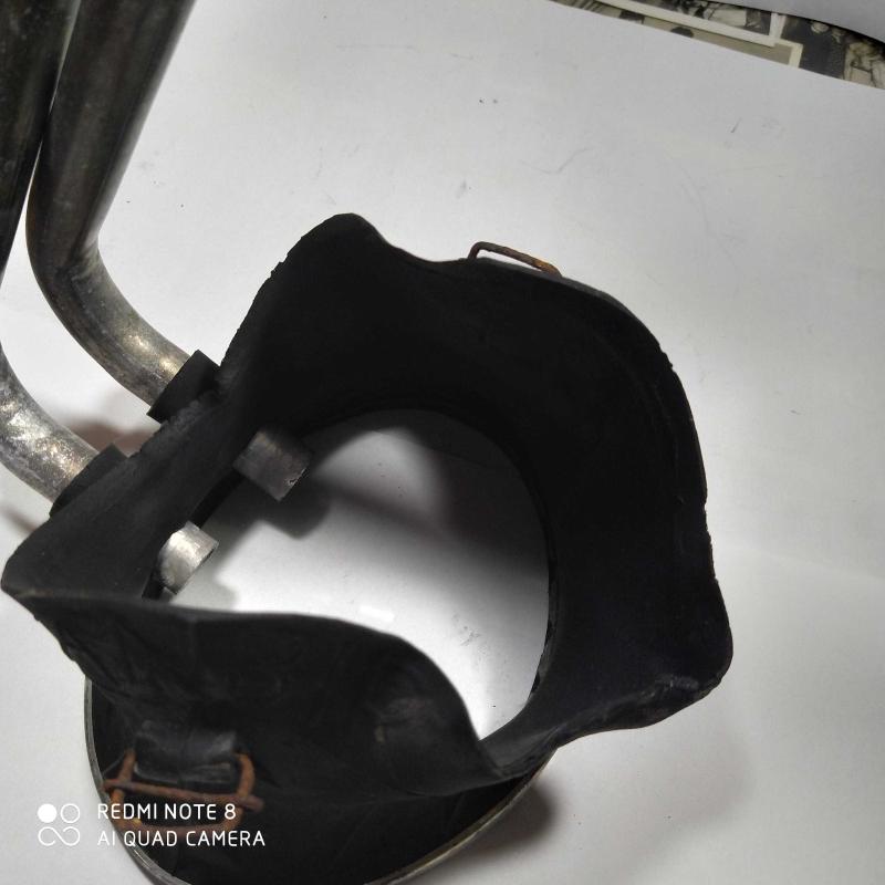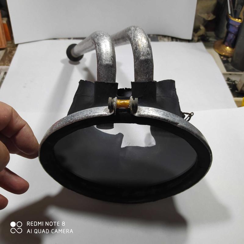 Diving mask with two breathing tubes inserted into sockets at the top. Metal rim topped with adjusting screw. Metal buckles on each side to retain and adjust head strap.