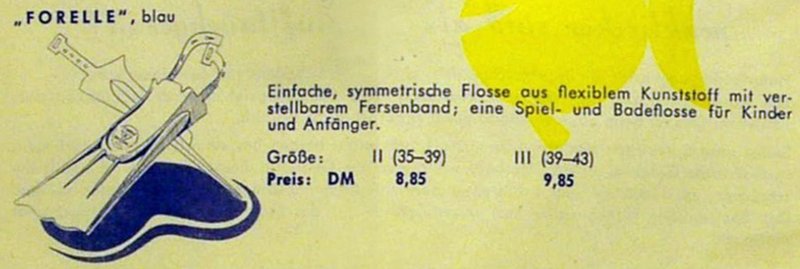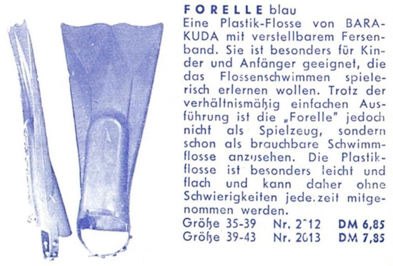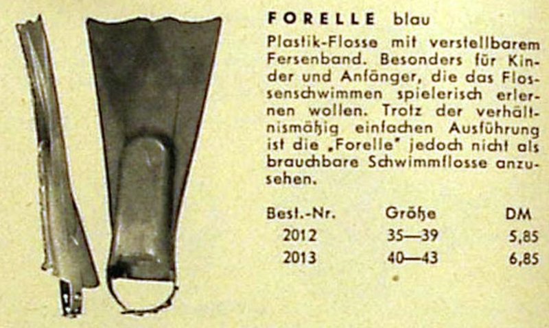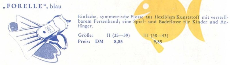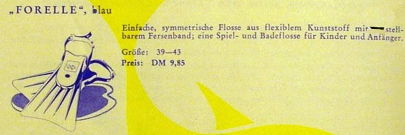 View attachment 534587The caption is worth translating because the original German should probably have been better proofread: "Forelle, blue. A plastic fin with an adjustable heel strap. Particularly (suitable) for children and beginners who want to learn how to swim with fins through play. In spite of the relatively simple design, however, the "Forelle" should not be regarded as a fully usable swim fin." Spotted the proofreading error perpetrated by somebody tasked with editing the 1962 caption for publication in the 1964 catalogue? Perhaps this error led to the premature demise of the "Forelle", foiling Barakuda's plans to raise the model's profile.