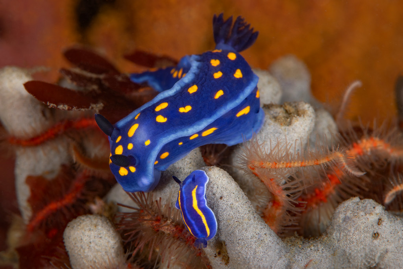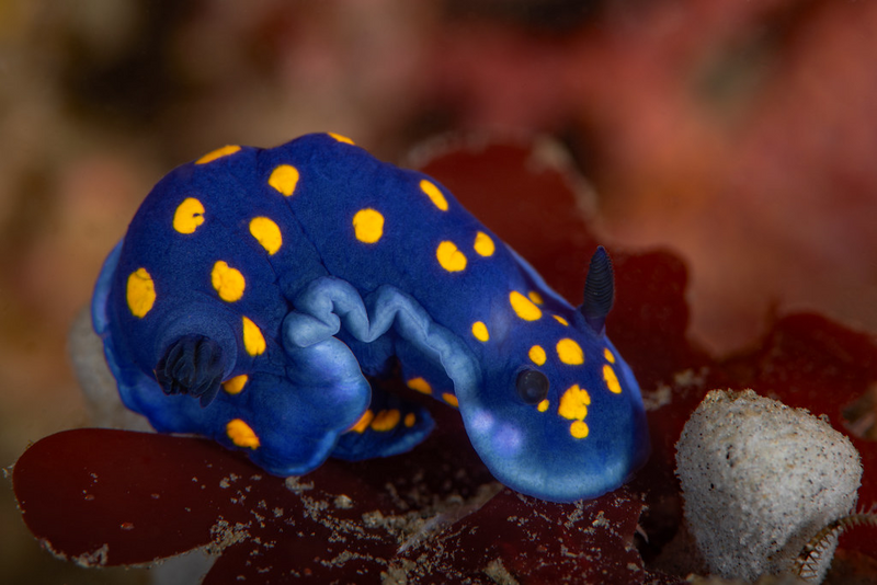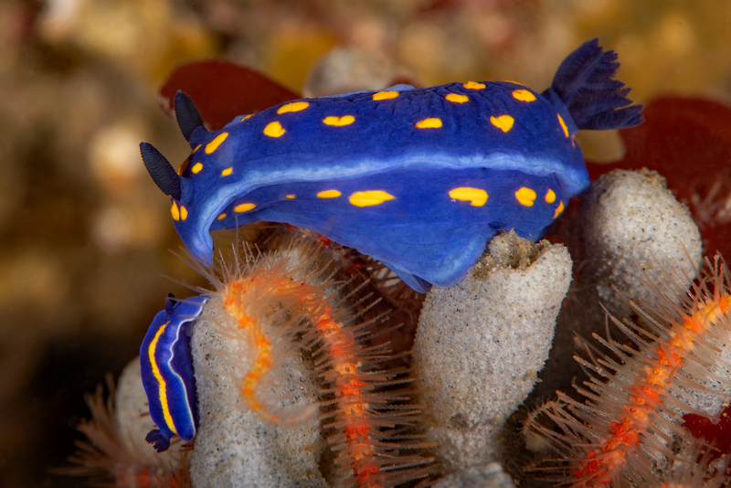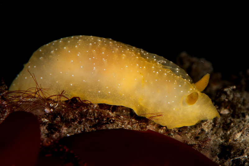Much better conditions at Golf Ball Reef this morning. Fifteen feet visibility with no surge. Schools of baitfish and Senoritas swirled around the reef while I crawled around the rocks. A Felimare californiensis was in the same spot that we've seen it for a year. A two-spot octopus less than two feet away stuck its head out of its den for the entire seventy minutes I was down there.