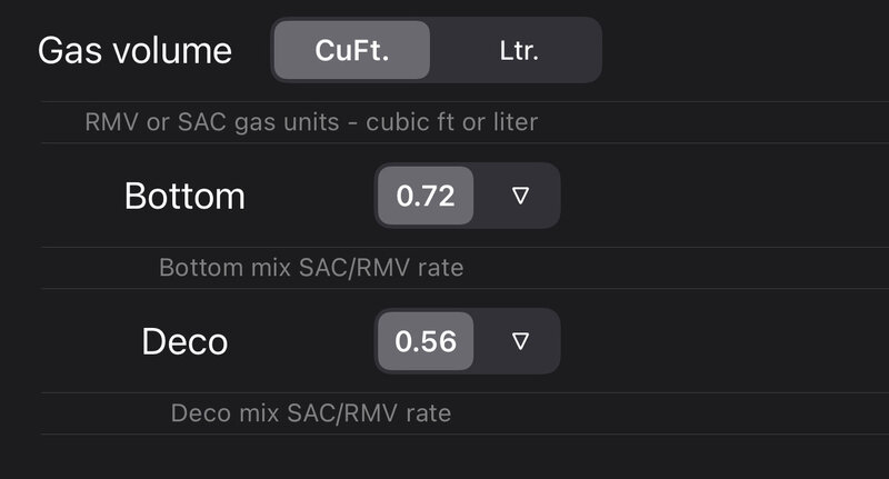 I run MultiDeco on my computer. The configuration uses only the term RMV and not SAC. It asks for volume units in imperial or metric.