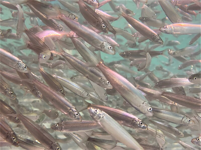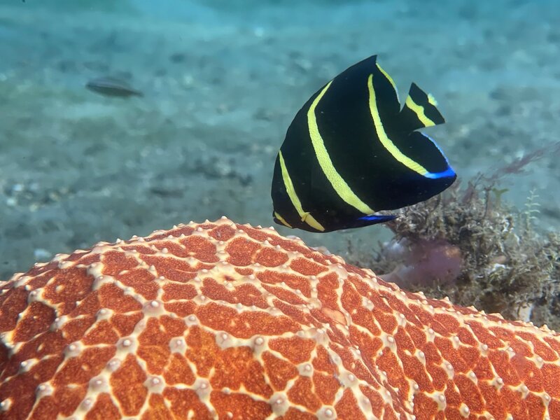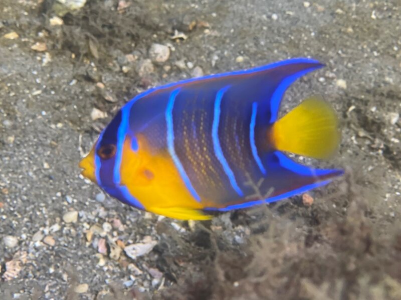 Went to the bridge for diving today. Arrived at 0800 for an 0900 high tide. The park was not crowded, though more people than I expected for a Monday morning. Entered the water at 0825, visibility was 30ft (somewhat better than yesterday), sea temp still holding at 78F. Did a REEF fish count, 75 species in sixty minutes. When trying tell juvenile Grey Angelfish from French Angelfish, the difference is in the coloring of the caudal fin. Grey Angelfish have a yellow body bar on the forward part of the caudal fin, the margin of the caudal fin is transparent. French Angelfish have the same yellow body bar on the forward part of the caudal fin, but the yellow goes all the way around the margin, like a little yellow ring. When trying to tell Juvenile Queen Angelfish from juvenile Blue Angelfish the body bars are the telltale. On the Queen Angelfish the body bars are slightly bent or arced, on the Blue Angelfish the body bars are straight. Lastly the two most common silver baitfish observed at the Phil Foster Park are Scaled Sardines and Spanish Sardines. They are somewhat difficult to tell apart. Scaled Sardines have a deeper body profile, and a slight greenish color mixed with the silver, Spanish Sardines have a less robust body profile and are more silvery. They are difficult to get still photos of because the color reflects strobe lights, and they move around so fast. Light was just right today to get a decent capture without strobe. Respectively Juvenile Queen Angelfish, Juvenile Grey Angelfish with slight genetic variation of coloring on caudal fin (another image of same individual is on the Oct 7, 2021 posting), Spanish Sardine, Spanish Sardine video.