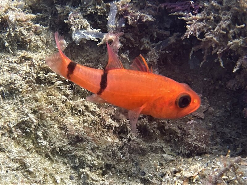 Last year I recorded a total of 257 species of fish at Blue Heron. I have never tried to match an image to every single species observed in one year. I am going to make an attempt at this year, though, it seems some species have an uncanny ability to be observed without image capture. For example I found a small Gold Spot Eel yesterday, but it receded back into its hole before I could get an image. Gold Spot Eels are far less common than their close and far more common cousin the Sharptail Eel. Gold Spot Eels have bright yellow spots with diffuse black borders, while Sharptail Eels have diffuse yellow or cream spots with no borders. Respectively, Barred Blenny and Tiger Goby together, Barred Cardinalfish, Juvenile Dusky Damsel, Peppermint Shrimp, and video of Two Spot Flounder.