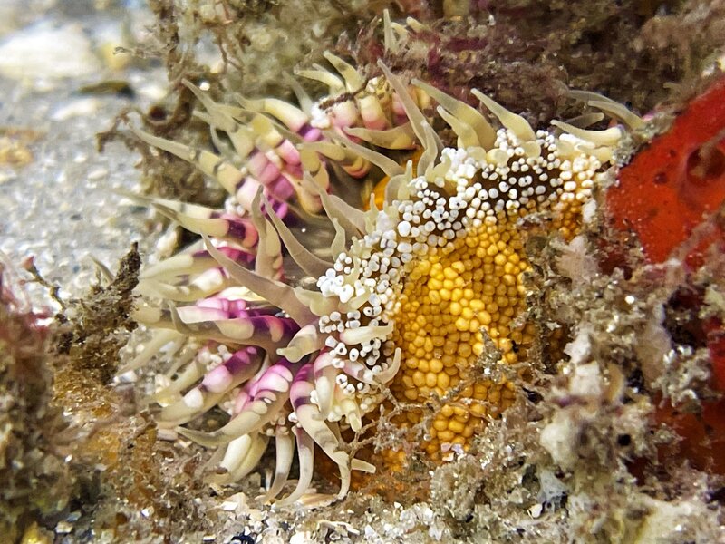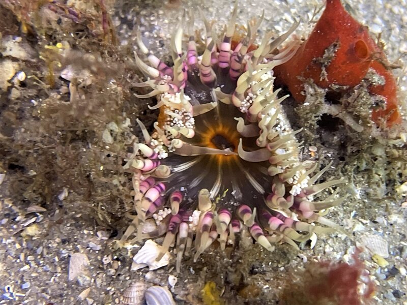 The common name of the anemone is red warty. I have seen them at BHB but they are much more common at the three bridges closest to the inlet in Jupiter. Two kinds there, purplish rings like yours and orange stripe. Size range from just hatched to the size of a baseball. Sometimes out in the open but usually in crevices or even under rocks buried in sand. They love to be fed...Went to the bridge for diving today. Arrived at 1120 for 1247 high tide. The above water visibility test just barely met the parameters of doing a dive, i.e. standing on the west side standing on the seawall or western most land based bridge piling can I see the bottom. Visibility in the water 10>vis>5. I did not have the same impression of yellow brownish yuk as @Jaan, but more of greenish/whitish haze. Sea temp remains at 75f. Did a REEF fish 59 species in 65 minutes.
