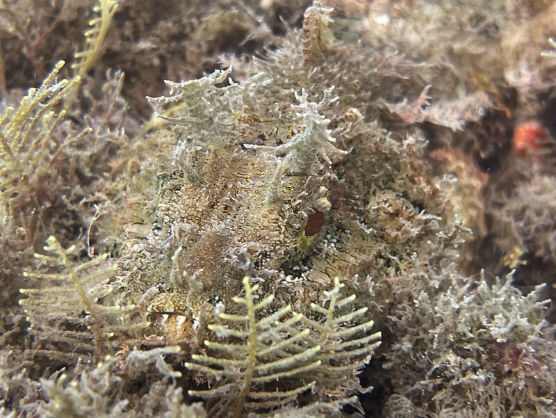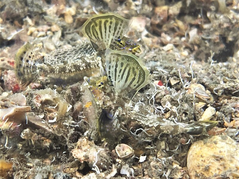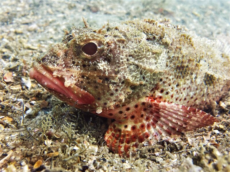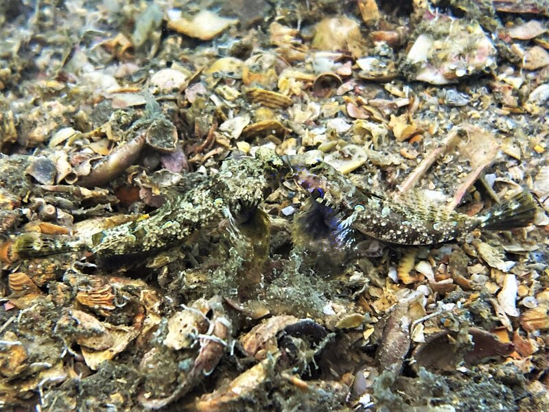 Near the end of the dive I observed a pair of Lancer Dragonets. All kinds of pushing, shoving, lip biting, and dorsal fin displays, I guess in an attempt to impress a nearby female. I stayed in the same spot watching them for fifteen minutes it was quite entertaining. Respectively, Lancer Dragonet video, Bunodosoma granuliferum, Barbfish, expertly camoflauged Spotted Scorpion, Lancer Dragonet 1, Lancer Dragonet 2.