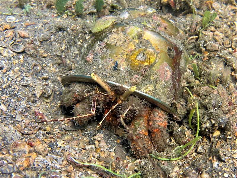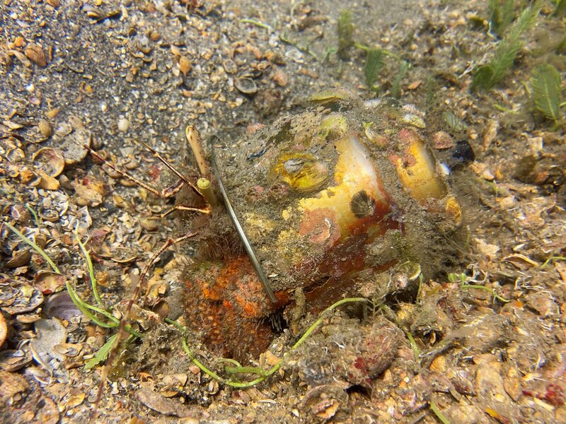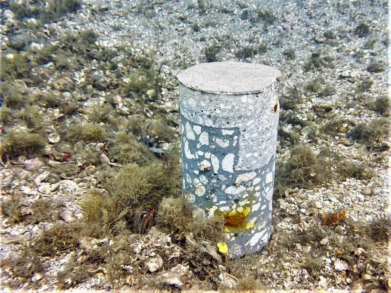Went to the bridge for diving today. Arrived at 0735 for a 1034 high tide. Parked down on the westside where I always park, regardless of the area under bridge being closed. I guess there are people getting there way early to get spaces all the way to the east. As I walked over that way to snorkel at 0815 their great pride in having captured these parking spaces is palpable, whatever. Snorkeled the trail prior to diving, visibility was good at 35 feet. Finished snorkeling at 0905, returned to my truck and by this time the parking lot was completely filled. Entered at 0925 and did the west side. Sea temp was 79f. It was quiet over there, only encountered a few other divers for the 140 minutes I was on scuba. I believe the swim back and forth to the westside plus the presence of the turbidity boom discourages people from that side of the bridge. Did a REEF fish count during the snorkel and during the dive. No extra ordinary fish observations today. Observed a Giant Hermit Crab with a makeshift home, some kind of pot, or bell, but definitely not a seashell. I found a couple cement core samples, I assumed were dropped after they drilled. You can see why they have underneath the bridge closed for the beach, one of these would definitely kill somebody. The way they have the turbidity boom anchored is a disgrace. Two concrete blocks attached with chains. The concrete blocks are not heavy enough to remain stationary, so four times a day they are dragged across the bottom as the tidal current have their way with the turbidity booms, its a real disgrace, its doing some real damage, you can see in the video. There are several of these "anchors" just tearing up the bottom making huge furrows and killing invertebrates that can't get out of the way. Respectively, Cement Core, Frogfish, Makeshift Shell, Makeshift Shell, Turbidity Boom, Turbidity Boom Anchor Video, Turbidity Boom Anchor Video, and Swimming With Spadefish Video
