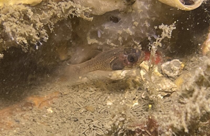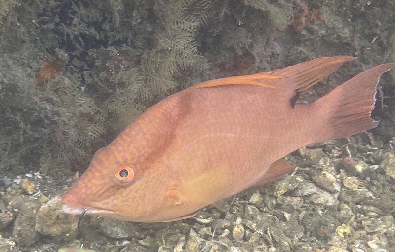 The find of the day yesterday was an Orangeback Bass. This is the third one I have found at BHB this year. They look like Lantern Bass except they have orange blotches on their bodies. Orangeback Bass are normally found at depths deeper than BHB, below sixty feet in areas of rubble adjacent to reefs. Orangeback Bass and Lantern Bass are synchronously hermaphroditic, i.e. they can mate as males and females. However, there is usually a dominant/territorial individual that functions only as a male and mates with the hermaphrodites more so than the hermaphrodites mating with each other. Also observed a Seminole Goby and Purplemouth Moray. Seminole Gobies hide in borrows located in sand and rubble. They are uncommon at the bridge, unlike the similar looking and common occurring Banner Gobies that have burrows in the silt. They can be found in the space between the beach and snorkel trail, or just off the snorkel trail. Purplemouth Moray's commonly occur on shallow reefs like those at LBTS, but are uncommon at BHB.