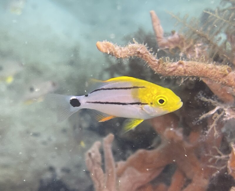 Went to the bridge for snorkeling this morning. High tide was at 0538, so even if I wanted to get there at sunrise I knew the high tide would be well past. However, because of the way the water flows past the island on the outgoing tide, visibility is sometimes acceptable 3-4 hours after the tide turns. That was the case today, entered the west side on snorkel at 0810. The visibility was 20ft with a green brown color, better than the visibility has been the last three or four times I have been there at high tide with the green white color. Sea temp was 78f. Spent a total of an hour on the snorkel trail and in the algae patches, expecting more seahorses to start showing up but did not see any today. Did a REEF fish survey of 50 species in 60 minutes.