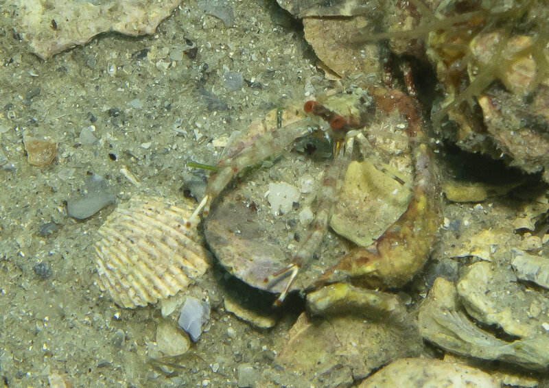 Seems that unusual critters and fish were out in force this particular day. Of note was a Magnificent Sea Urchin and an unidentified species of Squat Lobster. I have only seen a Magnificent Sea Urchin twice before in thirty years of diving South Florida. Once at the bridge, and the other in the sand not far the wreck called the Sea Emperor or Aqua zoo down off Deerfield Beach/Boca Raton. Apparently it is a deeper water species, so unusual so see it in shallow water. It happened to be that shortly after I observed the Magnificent Sea Urchin, @Scuba_Jenny showed up in the same area. So I was glad to share that discovery. I had observed a pair of the Squat Lobster species a couple weeks ago. I thought then it was a lucky find, and doubted I would ever run across the same again. But I found another, in the exact location as I found the previous pair (by accident was not looking for it). The image is not the greatest (the specimen is tiny and moves around a lot), however you can see the length of the claws compared to the body length. Looks like a three to one ratio of claw to body length. It is a strange looking species even for a crustacean. Also think I observed a species of nudibranch Cuthona tina, but its hard to tell because the specimen is all white and the image is over exposed, so just looks a bit like a white blob. Respectively, Squat Lobster (species unidentified), Magnificent Sea Urchin, Box Crab (species unidentified), Cuthona Tina ( I think), and Striated Frogfish