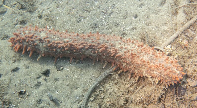 The rest of the week progressed much like Monday and Tuesday, with very unusual observations each and every day. The Magnificent Sea Urchin was still around on Wednesday but was not to be seen again Thursday, and Friday. On Wednesday the unusual find was the Sea Cucumber pictured below. I have no idea what species it might be, and cannot find images that match it on Inaturalist or any of the field guides I own.