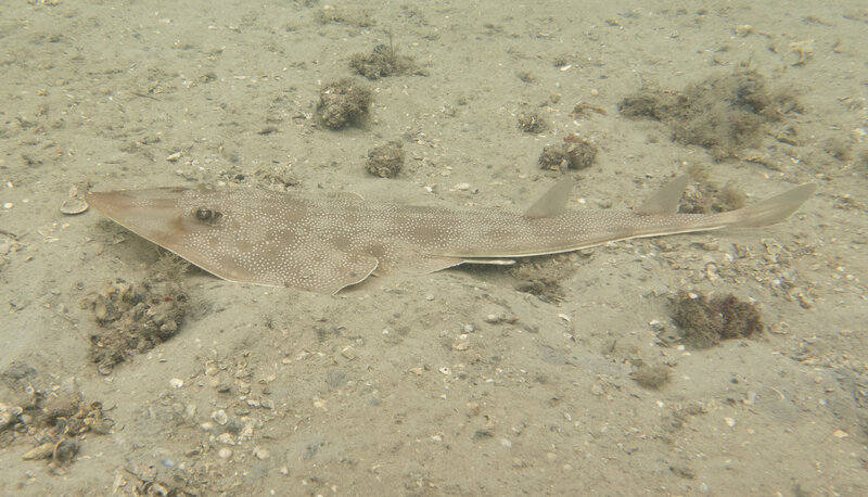...Funny that @Scuba_Jenny should mention Atlantic Guitarfish in regards to them being more common than Magnificent Sea Urchins. I have seen Magnificent Sea Urchins 3 times in thirty years. I have seen Atlantic Guitarfish 18 times in 4600 surveys over thirty years. So yeah Atlantic Guitarfish are more common, than Magnificent Sea Urchins, but still rarely seen (At least by me). I observed an Atlantic Guitarfish on Wednesday. First one at BHB. Image below.