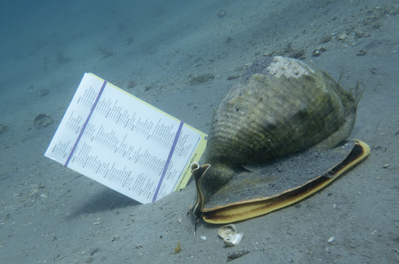 On Thursday observed a large specimen of a Queens Helmet aka Empreror Helmet. The REEF Survey slate is 9x6 inches, it gives a good indication of the size of the Queen's Helmet, image below. These are more common than both Magnificent Sea Urchins, and Guitarfish, image below.