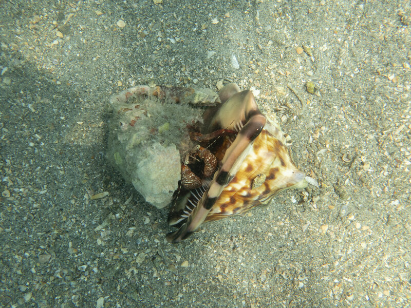 On Friday observed a large specimen of a King Helmet, being inspected by a prospective Hermit Crab home hunter. I could not see the mantle of the King Helmet, so there is a possibly if was just retracted deep within the shell. An intact King Helmet even though it is a large shell does not work well for Hermit Crabs, because the aperture is vary narrow relative to the shell size. Ironically, the shell that the Hermit Crab had on its back looked to be a very old and beaten up King or Queen Helmet, so much so that the crab had no problem occupying it. Image below,