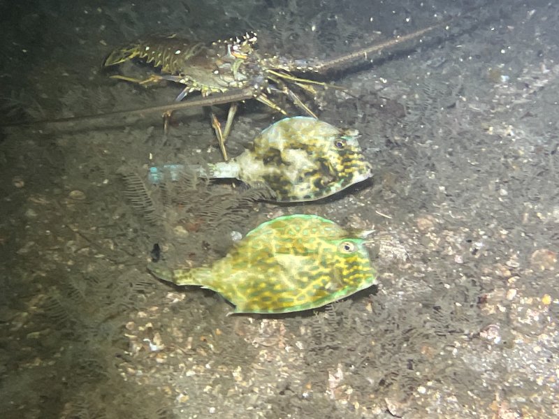 So we started the dive @1930 for a 2000 high tide and 1952 sunset. I take a similar route of the west side for guiding as when I am diving by my lonesome. Out to the west side of the snorkel trail, because I never get tired of the hammerhead shark statues (the powers that be should have made more statues for the snorkel trail), on to the sunken boat just outside the can buoy, and then northwest to the bridge pilings, down to the space between the "wall" and channel, barrier with a return back through the bridge pilings. I did not bother with a camera because of the visibility, plus I was keeping track of seven other divers. Despite the marginal visibility all divers enjoyed themselves. Crustaceans were out in force, box crabs, lobsters, and several species of shrimp I could not identify. Parrotfish sleeping all over the place like they just finished celebrating new years in 1999. They really show off some awesome coloration not seen during daylight.