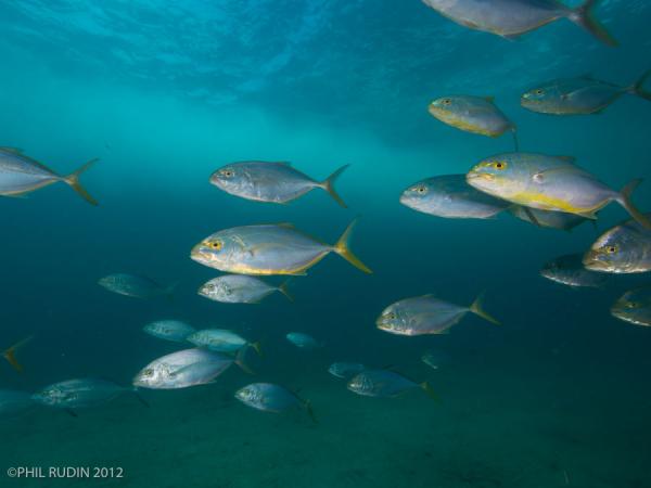 Yellow Jacks, not to be confused with the Horse-eye Jack which also has a yellow tail. You can see a boat going overhead at the time I took the photo, as I was looking west from the bridge pilings.