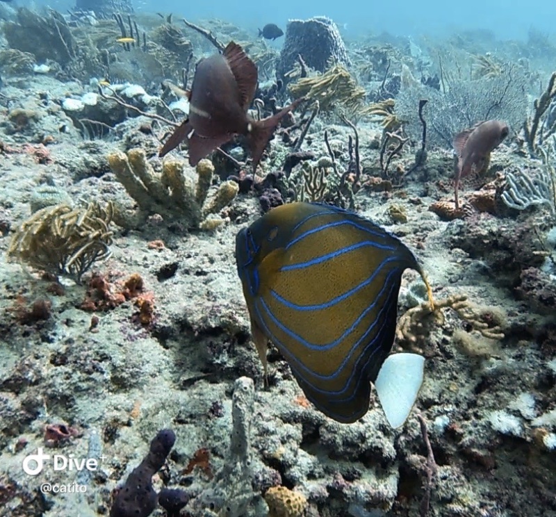 We dove with Pura Vida Divers on 9-27-2025, shallow reefs, 8 a.m. boat. On the second dive, the dive guide found an adult Blue Ring Angelfish (at about 50 feet). It had been spotted on a wreck a couple of weeks ago. Beautiful fish (we have video). Native to Indo-West Pacific. My guess is that it grew too large for someone’s aquarium and was dumped into the Atlantic. Pretty—but not native.