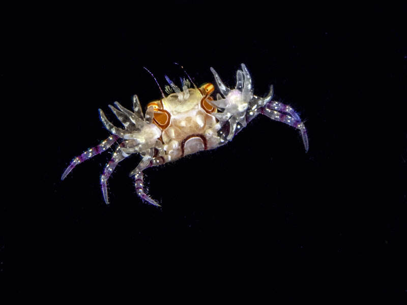 Here is a teeny (maybe 1/4 inch-6 mm) boxer crab from Ambon. He was out of his hole, walking around, I put my black felt piece in front of him and he crawled on. Enjoy