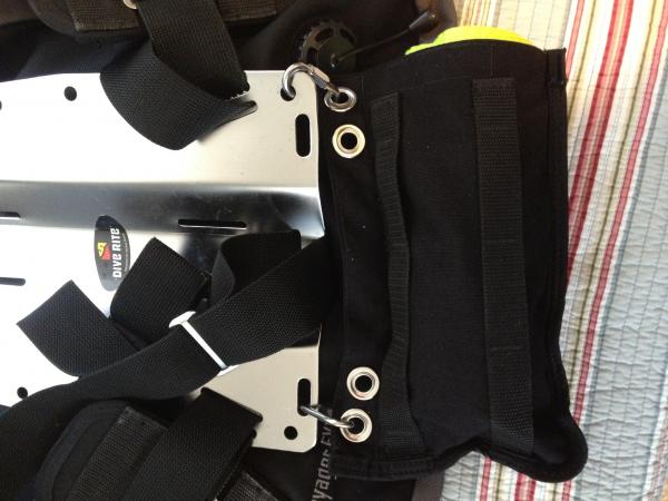 My DSMB (6ft) is attached to the bottom / base of my BP, held in place with two bungee loops. I also carry a lift bag, slipped into a Dive Rite sleeve which is attached (inverted) on the lower left side of the plate with a couple of pear clips. I have a double ender attached to the end ring of the bag, and also to the plate, so I can reach down, unclip the double ender from the plate, and pull the bag down and out of the sleeve. Canister light is attached on the lower right side of the plate, inverted, so all I need to do to turn it on is reach down and find the switch on the bottom of the canister (I keep it on the right side because I have the light head on my right hand).