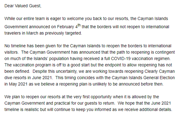 When will we open? We are unable to open our resorts until the Cayman Island Government opens up their borders for international travel. It is possible to travel there now, however you are required to quarantine for 15 days, which doesn’t work for the average vacationer. Their most recent Government announcement has said that it is dependent on vaccinations and no date has been given to hopefully reopen. When it does happen it is expected the Caymanian government will probably require the following: