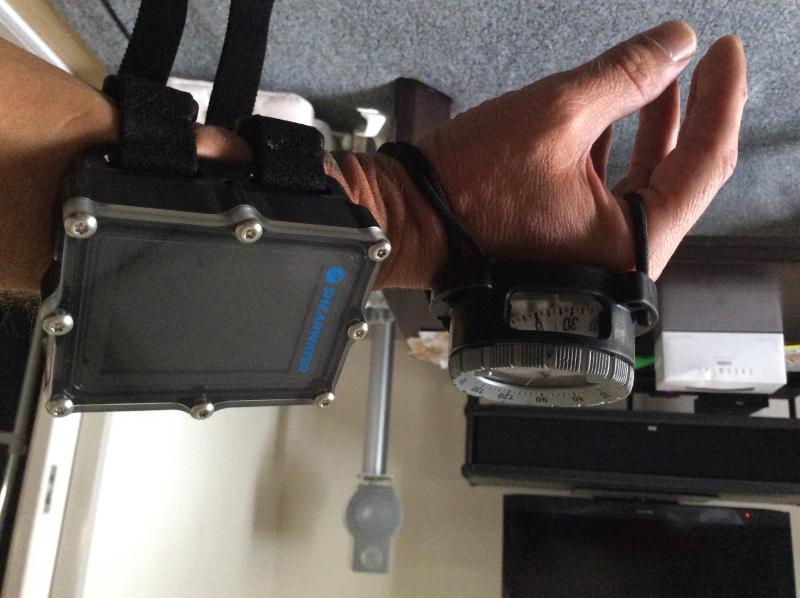 I don't wear my compass on my wrist as I find it awkward to use, I wear it atop my right hand so when in trim and linking hands in the parachute position the lubber line is pointing in the right direction without requiring any changes to swimming position. The Petrel on my wrist is not pointing in direction of travel and requires contortion I'm unable to do in order to have it pointing in the right direction. I can do it but its difficult, feels very awkward and is uncomfortable to me. Analogue or digital, for me, wearing atop right hand is the best option (I use no slate).
