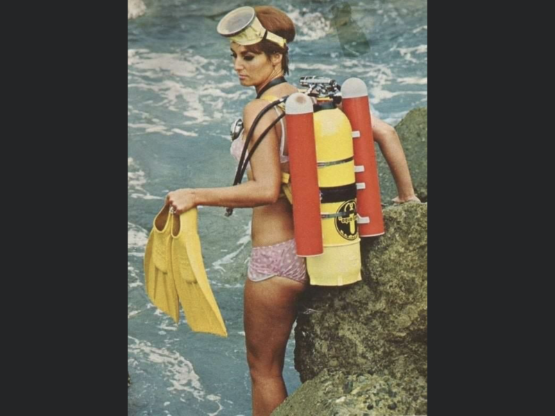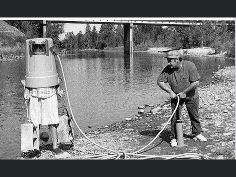 The view plate is duct taped to the outside of the trash can. It would likely blow out pretty quick and the cinder block are tied to the handles of the barrel. The purpose of the fins escape me.That rig looks completely safe since two cinder blocks wouldn't be enough to sink the inverted trash can more than a few inches, as long as he remembers to drop the blocks when the can floats off his body.