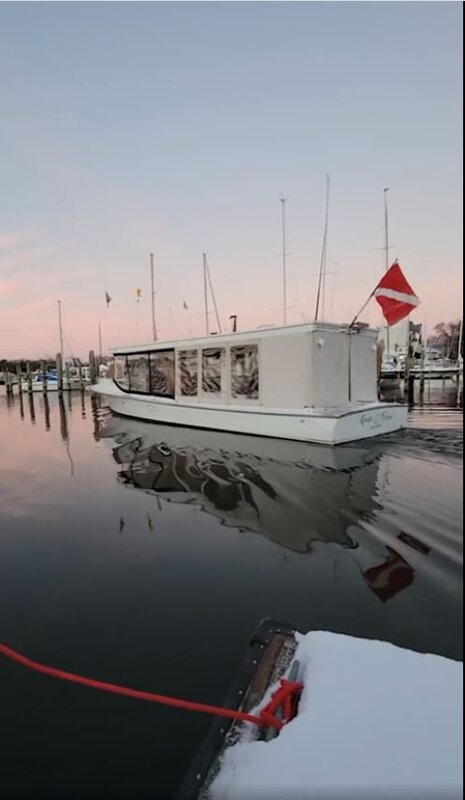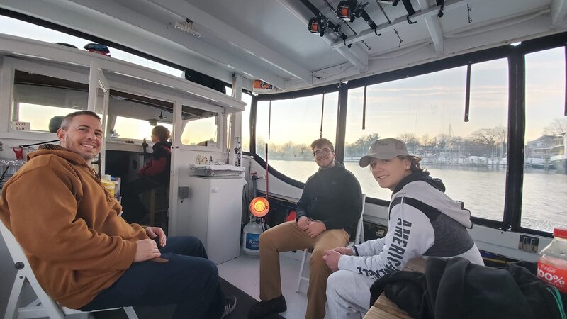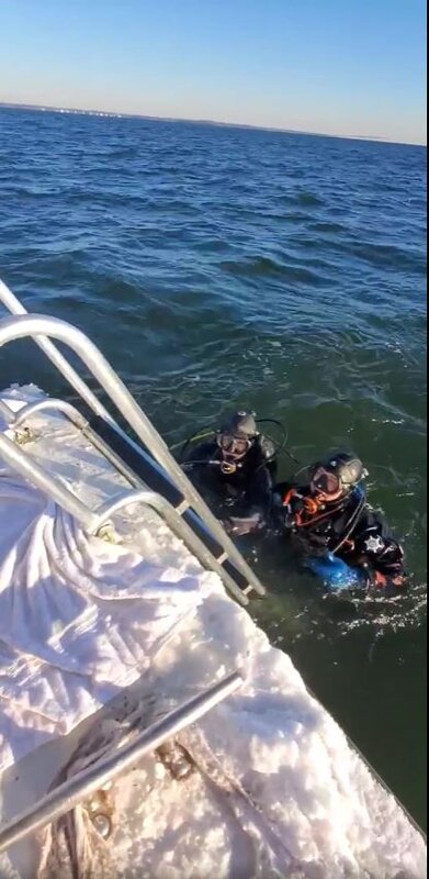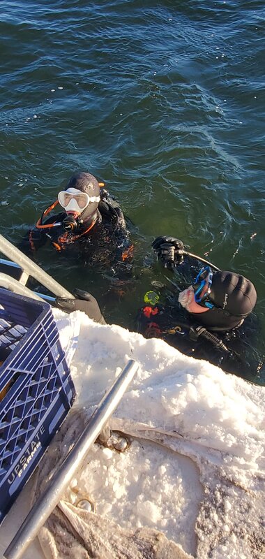 Arrived at the dock at 6:30ish or so. Left at sunrise around 7:15. Then it's about a 25-30 min boat ride out the the oyster beds. This is my 2nd time going. It's a different kind of diving. I can't stress enough that no matter how I explain this everyone thinks it's just nuts, but I promise it's a good time. It was 17f when we arrived at dock, but it did warm up to 25f or so. Water was nice and warm (compared to the outside temp