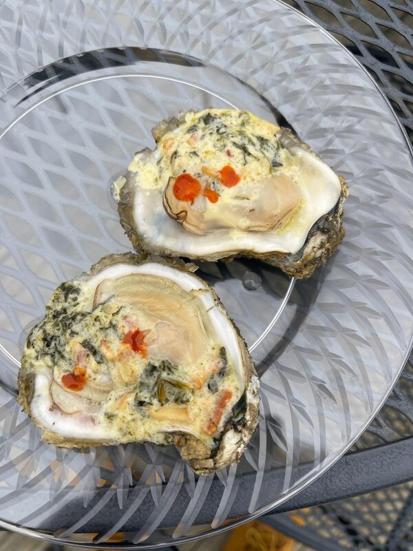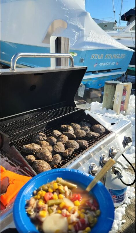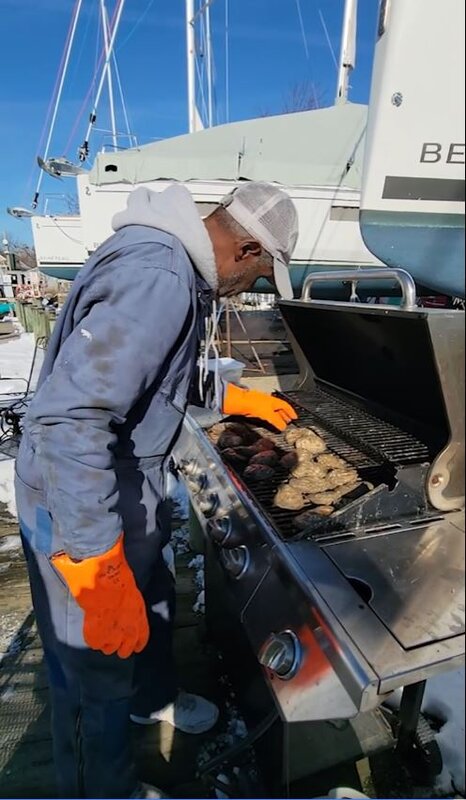 Same ~ 25 min ride back, just like any other boat.. get gear put away.. eat some oysters if you want. Once back at the pier we unload all our gear while the mate cleans the boat (takes him ~ 10 min) then they fire up the grill which is about 15' from the boat on the pier. We sit there and eat oysters until you're content.. I think all said and done we spend about an hr back at the pier. Adult beverages are shared but if you plan to drink they ask you bring some to share. Some food is provided on the boat... this time was Maryland crab soup and chicken wings... all was amazing.