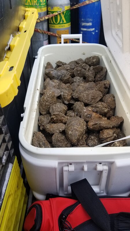 You buddy up (or solo if you've done it before) and each buddy grabs the side of a milk crate (milk crates must be a regional thing, lol). Then you dive. You drop down about 15'-20' and the milk crate hitting the bottom is about the only way to know you're close. Viz is about 3', but was 4'-5' last time I did it. I've been told it can get as bad as 6". You keep one hand on the crate at all times and search for oysters. After a bit you get into a rhythm with your partner... lift, move, drop, search, repeat. Even when I read this out loud it's sounds stupid.... but it's soooo much fun. The moving around, fighting into the current, and having a goal under water makes time fly and kept me pretty toasty. I didn't feel cold at all and to date 41f is one of my coldest dives. Getting back on the boat I was actually warm enough to do a 3rd dive, but by then it was time to go.