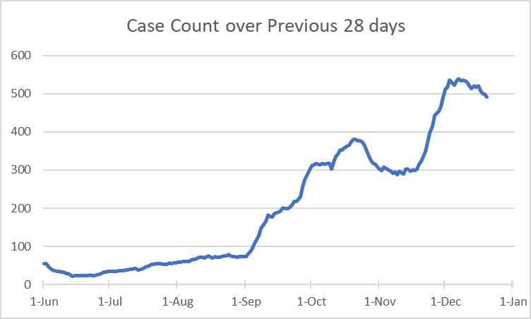 Today (Monday, 12/20) the CDC put Bonaire on Level 4, which is their highest travel risk, meaning they've averaged more than 500 cases per 100,000 residents for the last 28 days. If I'm doing the math right, that would mean 100-ish cases in Bonaire (population 20,000) in the last month.