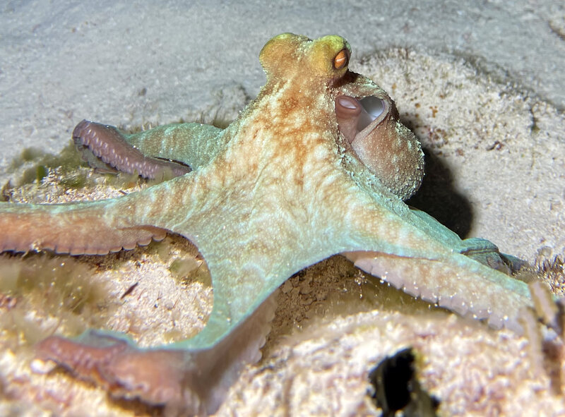 Some of the highlights of the diving was seeing 4 black tip reef sharks all in formation cruising right nearby us. Lots of morays (spotted and green). A splendid toad fish out free swimming on the night dive (just a gorgeous fish). A flying gurnard in the shallows at La Francesa. About 10 octopus out and about on the night dive also. A few nurse sharks, lots of large crabs and all of the usual Cozumel reef fish.