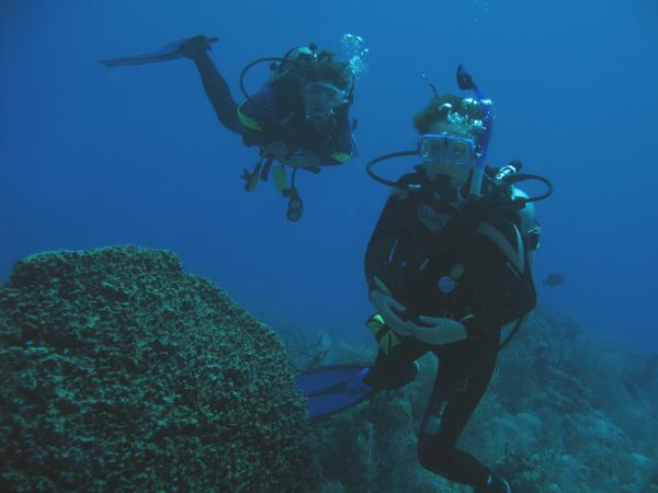 Ambergris is more understated and laid back and the main town, San Pedro, retains a strong local cultural flavor. And the cool propeller plane puddle jump from Belize City to SP sets the tone--I sat in the copilot's seat, with a total of 8 passengers (and the plane was full). "No shoes, no shirts, no problem," that's their motto and it obtains everywhere. Right now is high season, and my wife and I kept asking each other, Where are the throngs? Nowhere to be found, thankfully. There are loads of restaurants, from very local to more upscale, and the food is always fresh and sensational. The ubiquitous hot pepper sauce is habernaro and wonderfully deadly (we love spicy food). The people are over-the-top friendly, infectiously so. The island is safe. I left wetsuits and shoes and other stuff on our villa porch, and sometimes didn't even lock the door when going out. No problem. As for diving, I dove only the local reef and it was better than excellent. Nurse sharks (big ones) and spotted eagle rays and turtles and giant grouper and parrot fish and morays and the usual fare of colorful reef fish--all in abundance. What I was struck most by was finning over dramatic cavernous canyons, one after another on all dives. All my dives were off a smallish boat with 4 to 8 people. I had the good fortune of diving for four days straight with three sensational divers from Delray Beach, two of whom are well seasoned instructors. On our last morning of diving, we were joined by ScubaERdoc (I that's his name), from this board, and his wife.