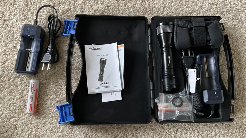 Purchased as a backup to my primary D550 dive light and has never been out of the case. I always dive with two large video lights on my camera rig, so my current D550 is essentially my backup. The kit comes complete with the D550 light, hard shell case, 18650 rechargeable battery (new), battery charger, hands free glove mount, lanyard, 3 replacement O-rings and owners literature.