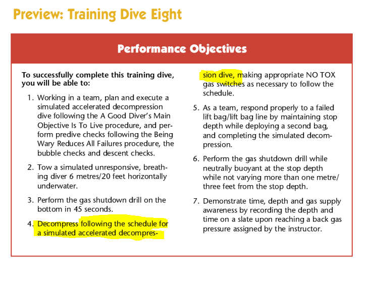I did the knowledge reviews... I did dives my instructor said to do and the skills he wanted me to do. All I'm saying is , is exactly what the manual says. Pretty black and white I'd say. There are NO actual decompression dives until you get to the Tec-50 portion of the manual.I have been pretty clear the the manual excerpts you are referencing are not the Tec 40/45/50 curriculum. This are for the Tec Deep and Apprentice Tec programs Which the manual was originally written for. The Tec 40/45/50 program is based on parts of the old manual with the handouts, study assignments, and knowledge review material you see linked at the bottom of the PDF page.