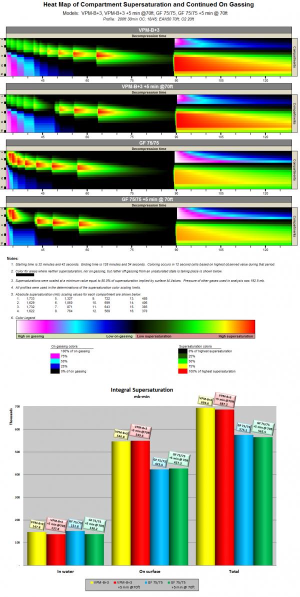 The heat map below is for OC 200ft 30min dive, 18/45, EAN50 at 70ft, 100 at 20ft. The profiles are generated by VPM-B+3 and GF 75/75. Each of those profiles then is shown with an extra 5 minutes of time spent at 70ft.