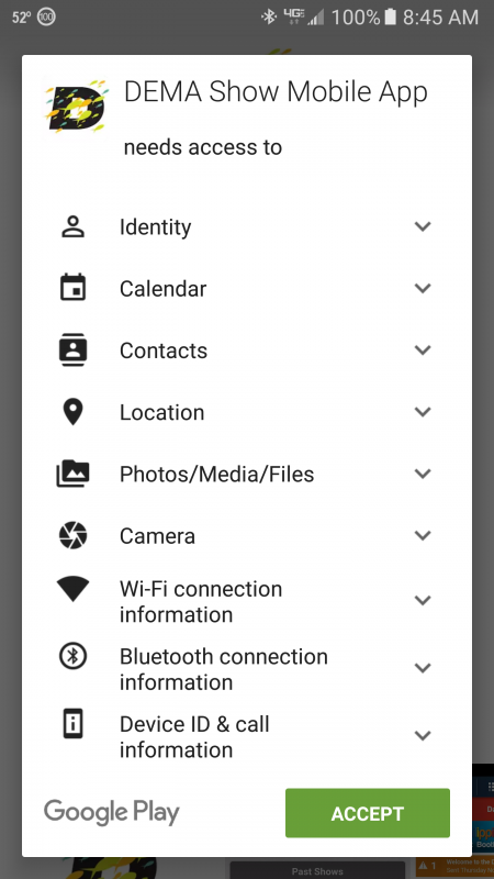 I think the DEMA app for mobile devices has gone a little overboard with the invasive permissions required to install the app. I mean, I just wanted to use the app to find the booths of my favorite vendors and such, but I don't see why the app needs to have access to my contacts, photos, etc... Really? Needless to say, I think the paper show guide is less invasive.