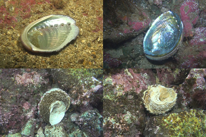 Image caption: Shells of young dead abalone and mature green abalone; empty shells of wavy top snails.